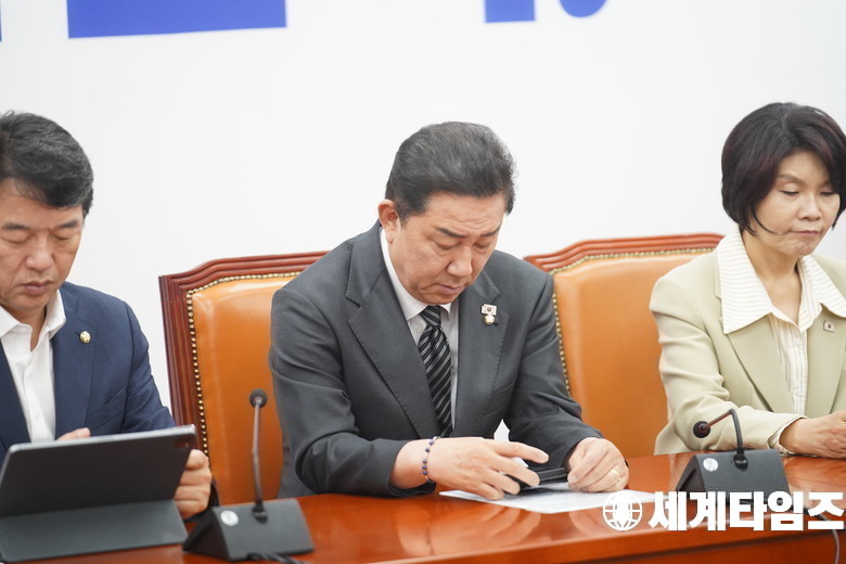 더불어민주당 '김병기' 원내대표가 26일 국회에서 열린 원내대책회의에서 이재명 대통령의 한미ㆍ한일 정상회담 결과와 관련해 발언하고 있다.