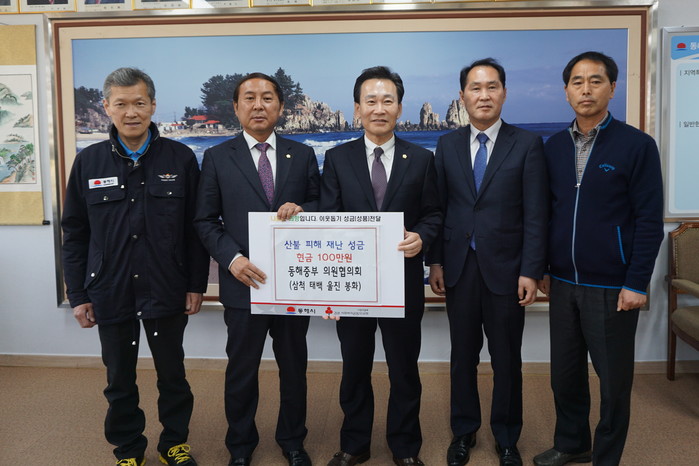 [동해시=세계타임즈 김민석 기자] 삼척시의회(의장 이정훈)와 동해중부의원협의회(회장 이정훈)는 2019년 4월 12일 동해시를 방문하여 산불피해 지원성금을 각 100만원씩 전달하였다.
