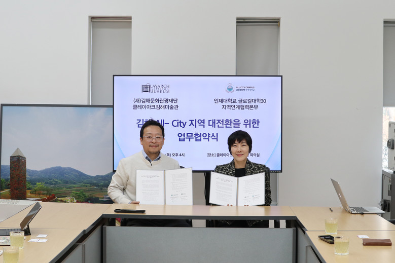 [김해시 세계타임즈=최성룡 기자] (재)김해문화관광재단 클레이아크김해미술관(관장 최정은)과 인제대학교 글로컬대학30 지역연계협력본부(본부장 이상협)는 2025년 2월 27일(목) 지역 문화예술 활성화 및 지역사회 발전을 위한 업무협약을 체결했다.