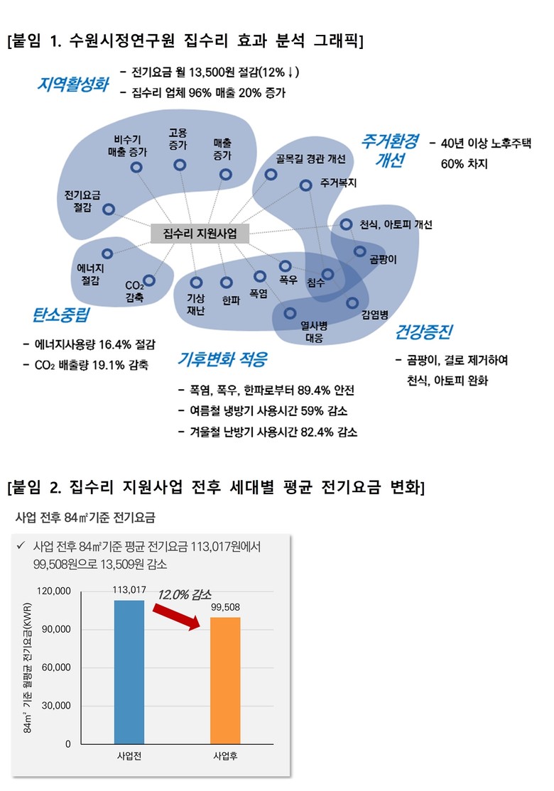 | 에너지 취약계층 아토피, 천식 개선 등 건강증진 기여 [수원시 세계타임즈=송민수 기자] 수원시가 추진 중인 저층 노후주택 대상 집수리 지원사업 ‘새빛하우스’가 경제·기후·주거복지를 동시에 해결하는 수원의 대표 혁신정책으로 주목받고 있다. 수원시정연구원(원장 김성진)은 집수리 지원 가구를 대상으로 분석한 사업 전후 효과를 발표했다.