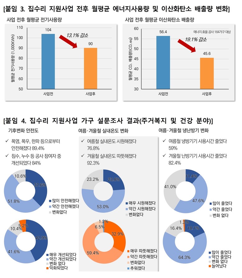 노후주택의 곰팡이와 결로 문제 해결로 저소득층 및 노년 가구의 주거 환경이 개선되고 기후변화 안전도가 높아졌다. 에너지 효율 공사를 한 171가구를 대상으로 한 설문조사 결과에 따르면 집수리 지원 가구 89.4%는 폭염·폭우·한파 등 기후위험으로부터 안전해졌고, 84%는 침수·누수 등 주거환경 개선을 체감했다고 응답했다. 천식·아토피 등 알레르기성 질환 완화 사례도 다수 확인되어 주거환경 개선이 건강 증진에 기여한 것으로 분석됐다.