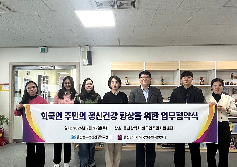 [동구 세계타임즈=이호근 기자] 울산동구정신건강복지센터(센터장 전진용)와 울산광역시 외국인주민지원센터(센터장 박유리)는 지난 2월 27일 오전 11시 동구 내 외국인 주민의 정신건강 증진 및 자살예방 체계 구축을 위한 업무협약을 체결했다.