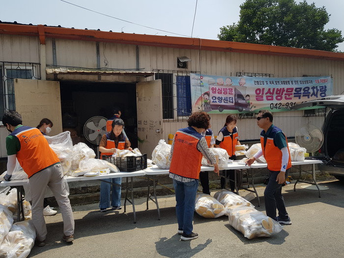 폭염날씨에도 유희자 단장을 비롯한 자원봉사자 15명은 실내화를 사이즈별로 정리후 예찬지역아동센터, 남대전 지역아동센터 소망 지역아동센터, 하늘꿈 지역아동센터, 덕암동 지역아동센터에 각100켤레씩 배달을 하였다.