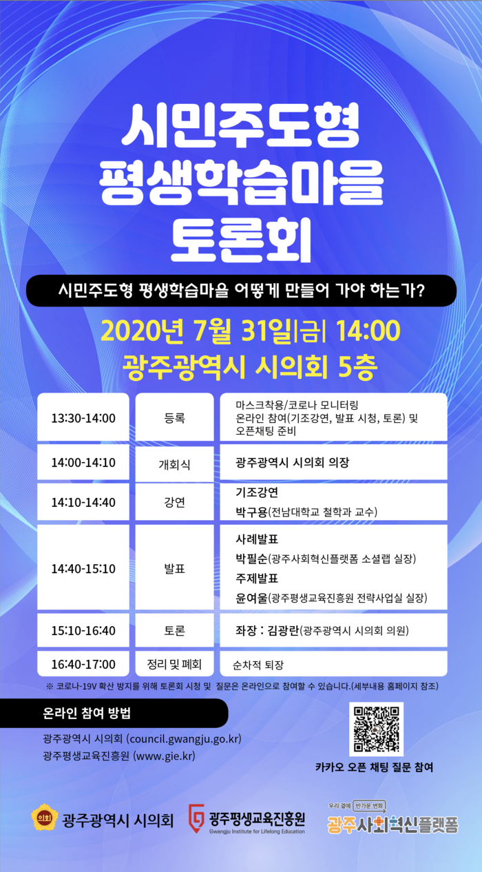 [광주=세계타임즈 손권일 기자] 7월31일(금) 2시에 광주광역시의회 5층 회의실에서 ‘시민이 주도하는 평생학습장 마련’을 위한 정책토론회가 개최된다.