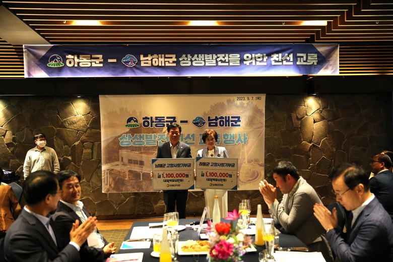 [하동군 세계타임즈=최성룡 기자] 하동군의회(의장 이하옥)는 고향사랑기부제를 널리 알리고 인근 남해군과 서부 경남 상호발전을 위해 지난 7일 남해군의회와 고향사랑기부금 교차 기부를 했다고 8일 밝혔다.