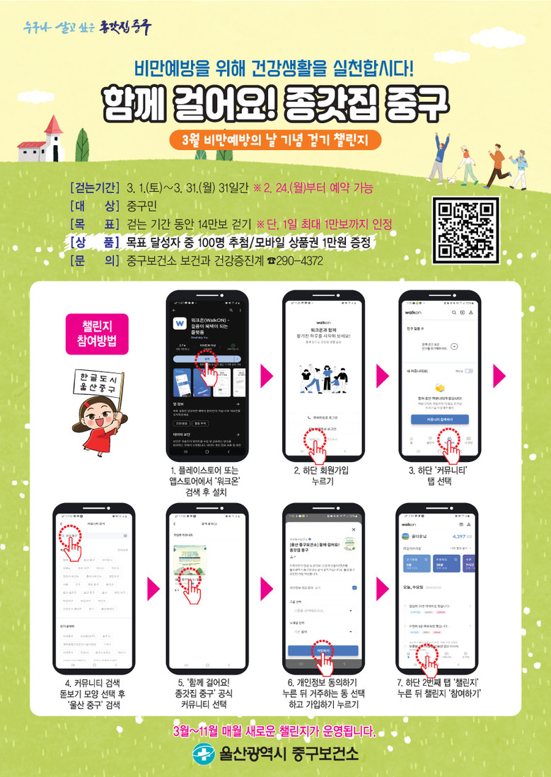참여를 원하는 경우 스마트폰에 ‘워크온’ 앱을 설치한 뒤 중구보건소 공식 모임(커뮤니티)에 가입해 참여 신청을 하면 된다.