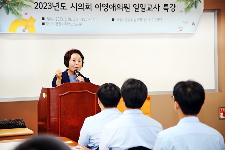수업을 마치며 이영애 의원은 “특히 교육위원회 위원으로서 앞으로도 교육 현장에서 발로 뛰며 여러분과 더욱 소통하겠다”고 밝혔고, 학생들에게 지방자치에 대한 관심과 적극적인 참여를 통해 건강한 지역사회 구성원이 되어주기를 당부하면서 일정을 마무리했다.