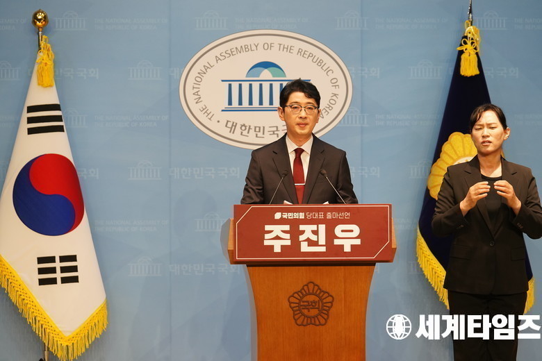 국민의힘 '주진우' 의원이 24일 서울 여의도 국회 소통관에서 국민의힘 당대표 출마 선언 기자회견을 하고있다.