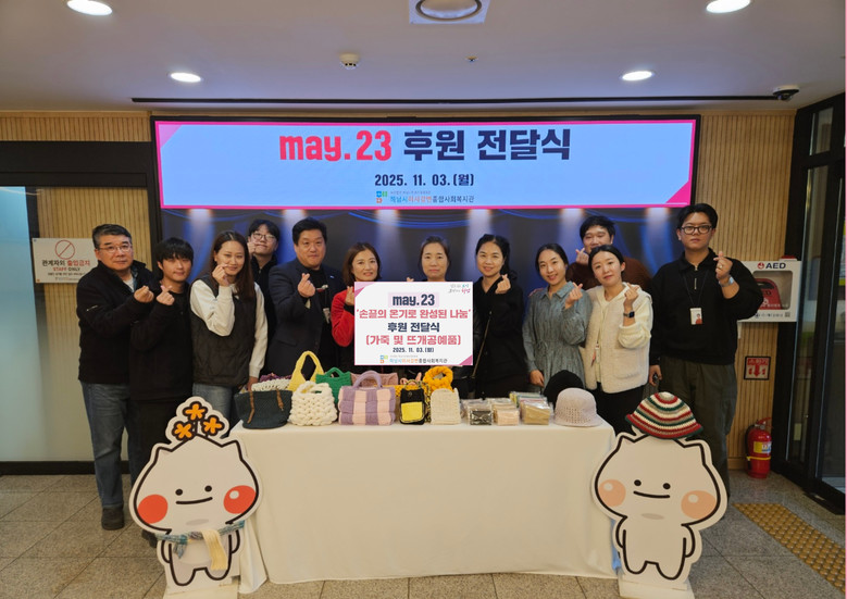 ‘may.23’은 체계적인 교육을 받은 뜨개 전문가와 가죽공예 작가들이 함께하는 마을공방으로, 정성을 담은 수공예 제품을 통해 지역사회에 따뜻한 마음을 전하고 있으며, 지난 2023년 12월에는 휴대폰을 자주 분실하는 독거어르신들의 불편을 해소하고자, 한 땀 한 땀 정성 들여 만든 휴대폰 케이스를 복지관에 전달였다.