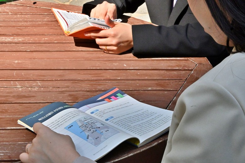 | ▲ 신천지 바돌로매지파 성도들이 성경을 찾아보며 묵상집으로 이야기를 나누고 있다 |