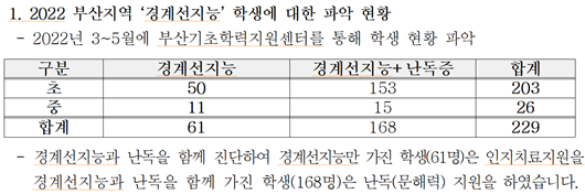 - 지난해 초 부산기초학력지원센터가 파악한 현황 자료에 따르면 △‘경계선지능’ 학생은 61명(초 50명, 중 11명), △‘경계선지능과 난독증’을 함께 가진 학생은 168명(초 153명, 중 15명)으로, 총 229명의 학생이 이에 해당되는 것으로 나타났다.