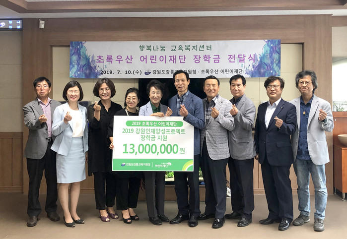 [강원도=세계타임즈 김민석 기자] 초록우산 어린이재단 강원지역본부(본부장 고주애)가 10일 전 11시 강원도강릉교육지원청에서 관내 재능아동 지원을 위한 인재양성 장학금 1,300만 원을 전달했다.