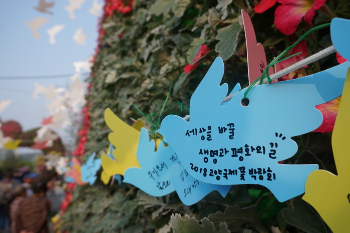 2018고양국제꽃박람회에는 희망의 메시지를 남겨 볼 수 있는 ‘평화의 꽃길’이 있다. 평화의 꽃길에는 이미 수많은 사람들의 올해 소망과 평화를 기원하는 메시지로 가득하다. 즐거운 볼거리와 특별한 추억 만들기가 가득한 2018고양국제꽃박람회는 고양시 호수공원에서 오는 13일까지 개최된다.