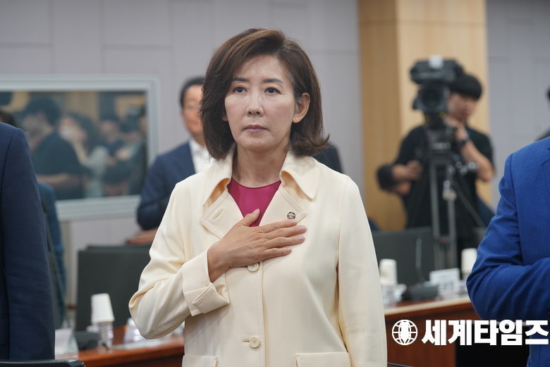 '나경원' 국민의힘 의원이 26일 오전 서울 여의도 국회 의원회관에서 '이재명정권 외교·안보 노선, 어디로 가는가' 긴급토론회를 연 자리에서 국기에 대한 경례를 하고있다.