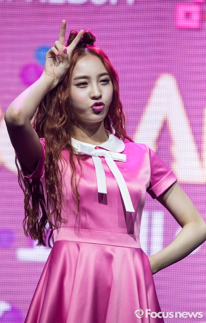 (서울=포커스뉴스) 29일 오전 서울 마포구 예스24 무브홀에서 열린 걸그룹 소나무의 미니앨범 '넘나 좋은 것' 쇼케이스에 참여한 멤버 나현이 포토타임을 갖고 있다.