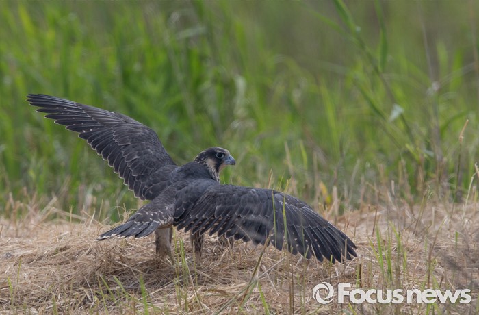 (인천=포커스뉴스)송골매유조 암컷이 바람이 불자 양 날개를 펴고, 바람을 이용 비행할 수 있는 적응연습을 하고 있다.