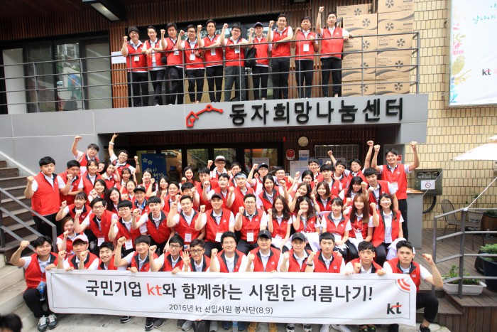 KT의 지원 활동은 이번주 11일에도 계속될 예정이며, KT 사랑의 봉사단은 대전 동구청에 위치한 쪽방촌 주민 100가구에 선풍기 100대를 지원할 예정이다.봉사활동이 끝난 후 KT 2016년 하반기 신입사원들이 동자희망나눔센터 앞에서 기념 사진 촬영을 하고 있다.<사진제공=KT>