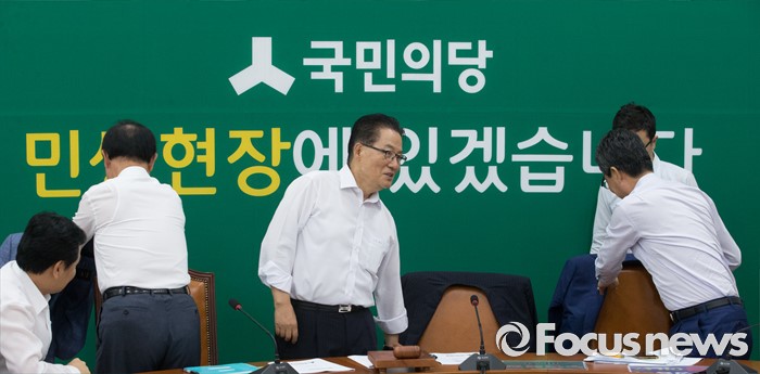 (서울=포커스뉴스) 11일 오전 서울 여의도 국회에서 열린 국민의당 원내정책회의에 참석한 박지원 비상대책위원장과 김성식 정책위의장 등 의원들이 겉옷을 벗고 있다.