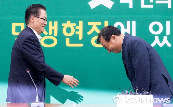 (서울=포커스뉴스) 11일 오후 서울 여의도 국회에서 박지원(왼쪽) 국민의당 비상대책위원장이 이정현 새누리당 대표와 면담에 앞서 인사하고 있다.